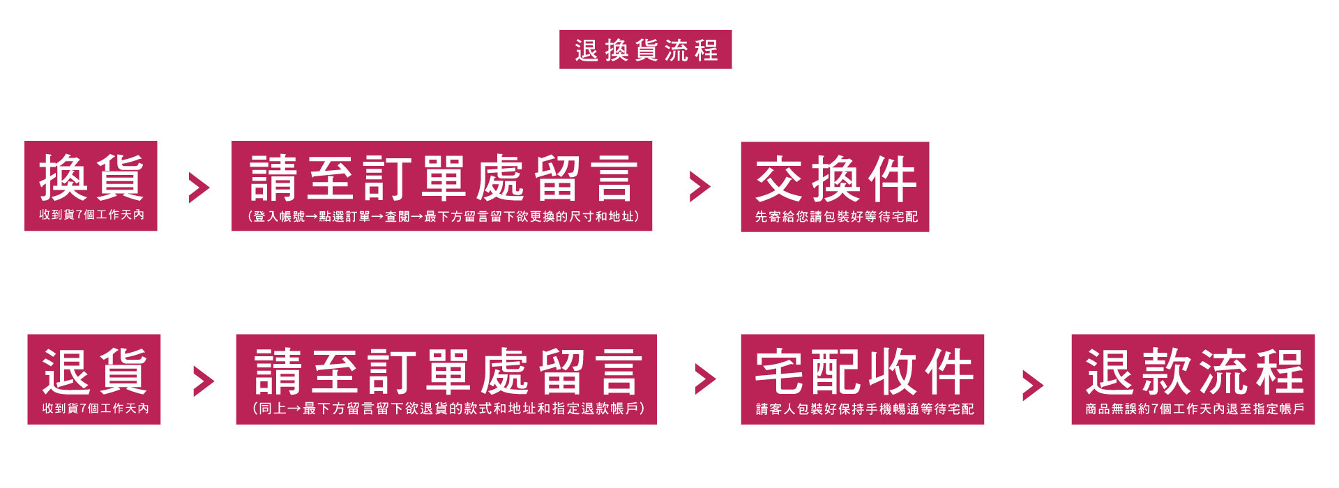 収到商品確定要換貨 → 請至官網點選您已購買之訂單→在欲換貨的訂單內留言要換的尺寸和完整換貨地址 → 客服收到通知會跟客人電話連絡確認換貨資料 → 採交換件 先寄新的給您 宅配送達時當下跟您收回舊品
